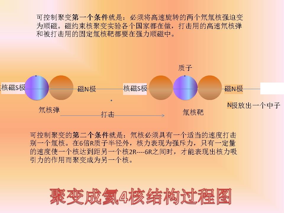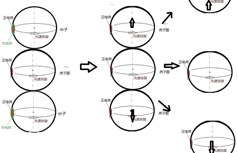 中子原不产生磁,但随着质子产生,正电荷随着质子光速自旋,由此产生了磁场,随着质子中子反被磁化。从此宇宙有了质量和磁场。质子有了磁场带动两极产生更多的中子,在高温高能下中子又分裂质子和电子,同一轴上相互靠近的两个质子,迅速排斥,假设以1/1000的光速排斥,大于1000次分裂就达到超光速。这样连所分裂的结果就是爆涨。如图: