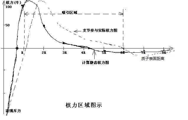 《奥源书》核力性质和核力大小的计算,可以看到核力主要在质子半一个R至6R之内是吸引力区,表现在主轴上。质子中子之间靠接触磁场吸引,质子与质子之间靠间隔一个中子或两个中子磁场结合,之间三个中子组成的物质会立刻裂变。其中的磁场来源于各个质子正电荷的光速自旋、质子中子组成物质强磁化。小于R或大于6R表现为斥力。力表现在主轴范围及次轴上。