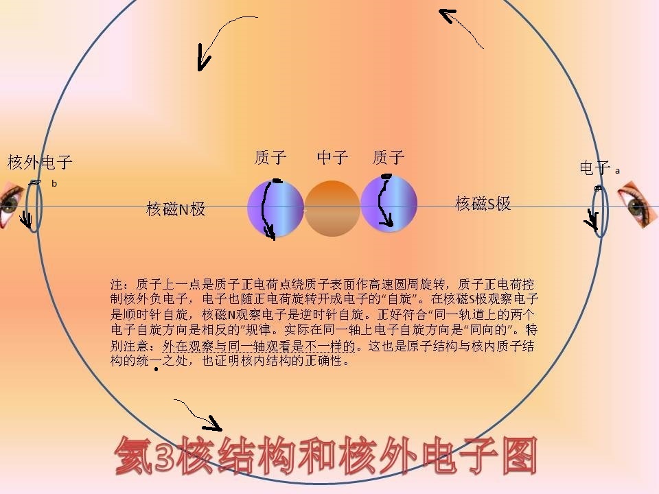 这也验证弱作用下宇称不守恒,实际是NS极结构不对称。也能验证包利不相容原理,同一个原子轨道上最多可容纳两个电子,而这两个电子的自旋方向必须相反;注意:这里是观察者不动(左边眼球),原子旋转到左边眼球处,此时看到头个电子b同自旋过来的另一电子a自旋相反。实际如下图: