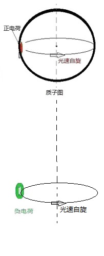 大于温度10亿度时,核外电子自由自在,电子是不自旋的。当温度降到小于10亿度左右时,电子因为负电荷被质子的正电荷吸引;质子正电荷光速自旋,吸引电子负电荷随着自旋,所以电子以质子半径为自旋半径、以光速自旋,如图:
